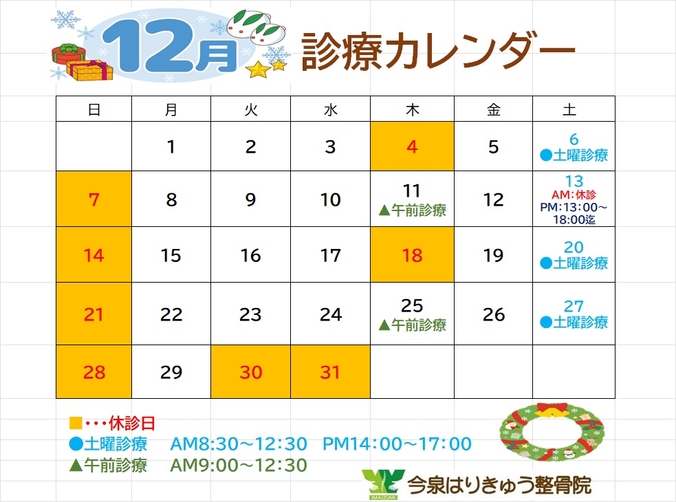 12/13(土)は午前中は休診、午後は13:00~18:00迄の診療となります。